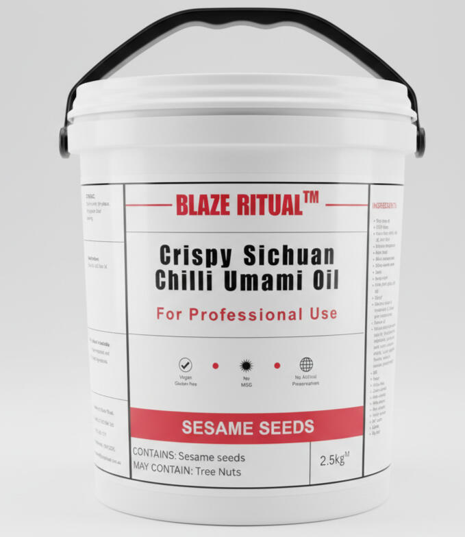Blaze Ritual is a premium crispy Sichuan chilli umami oil in 2.5 kg food-service tubs for high-end restaurants, boutique hotels, and professional kitchens. Vegan, gluten-free, no added MSG, Australian-made.